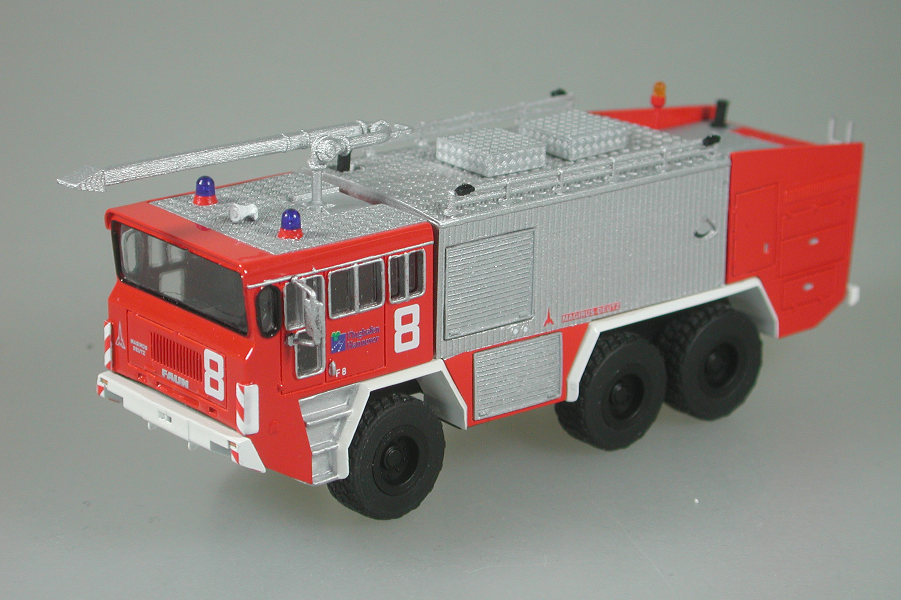Das zweite Modell ist nach dem Vorbild des FAUN LF 910 V 6x6 der Flughafenfeuerwehr Hannover entstanden. Hier mag sich manch ein Bastler/Sammler fragen, wieso der schmaler ist, als der vergleichbare "Große Bruder" von Preiser. Nun - das ist vorbildgerecht. Der FAUN LF 910 V 6x6 ist tatsächlich nur 2.750 mm breit , während der Vierachser 3.080 mm breit gewesen ist. Mit diesem Hannover'schen FLF 40/9.000/1.000 wird eine kleine Reihe von FAUN Flughafenlöschfahrzeug-Modellen begonnen, dem noch in diesem Jahr zwei weitere Fahrzeuge folgen werden. Ich habe im Hinblick auf das für Sommer vorgesehene Modell des Frankfurter Z8-FRA neue Felgen für meine großen FLF Reifen (16,6 mm) anfertigen lassen. Diese haben nun 1-mm-Achsbuchsen und sind nicht mehr mit der Nachbildung der Reifendruckreguliereinrichtung versehen. Der Hannover'sche Faun ist das erste Modell, bei den diese neuen Felgen verwendet werden. Der Bausatz ist unter der Artikel-Nr. 05.001.017 im Programm.