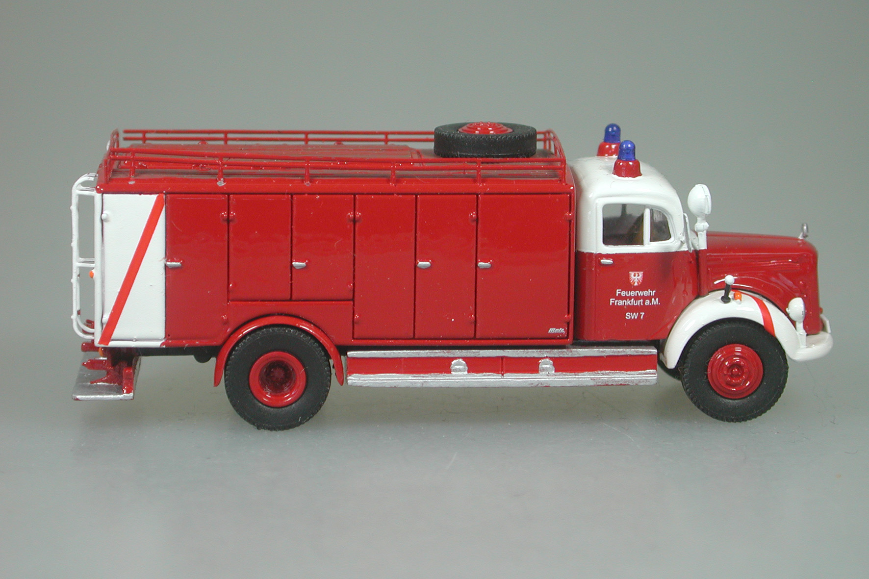 Dann folgt der schöne alte SW 2000-T,in vorbildgerecht rubinroter Lackierung im Look der BF Frankfurt der Sechziger und Siebziger Jahre. Der Resinaufbau ist auf das Brekina Basismodell abgestimmt. Weil die Brekina Modelle, die mir zur Komplettierung des Bausatzes zur Verfügung stehen keine Blaulichtsockel haben, füge ich zwei Blaulichtsockel mit passgerechter Dachschräge bei. Zur einfachen Montage empfehle ich, in dem Kabinendach an entsprechender Position Bohrungen (1,5 mm Durchmesser) vorzunehmen und die Blaulichtsockel durch den Stift zu positionieren und dann von unten zu verkleben. Deutlich größer, als bei vergleichbaren MB Haubern waren in Frankfurt die Außenspiegel. Diese liegen als Ätzteile bei. Sehr fein gearbeitet sind auch die Geländer. Wermutstropfen: Wie sehr häufig sind die Markierungen auf dem Aufbaudach nicht ganz exakt passend zu den Stützen am Geländer. Für das Geländer ist es also erforderlich die Bohrungen mit 0.5 mm Bohrer anzupassen. Der Bausatz hat die Artikel-Nr. 05.003.125.