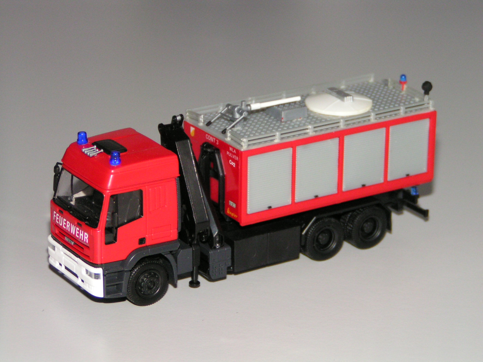 Die Anregung zu diesem Modell stammt vom WLF der FF Ravensburg. Kombiniert wurde das WLF-Fahrgestell von RMM, die Kabine und weitere Teile einer roten Rietze-Iveco-Sattelzugmaschine sowie der Ladekran von herpa. Verschiedene Teile aus der Krabbelkiste machen den Rest.