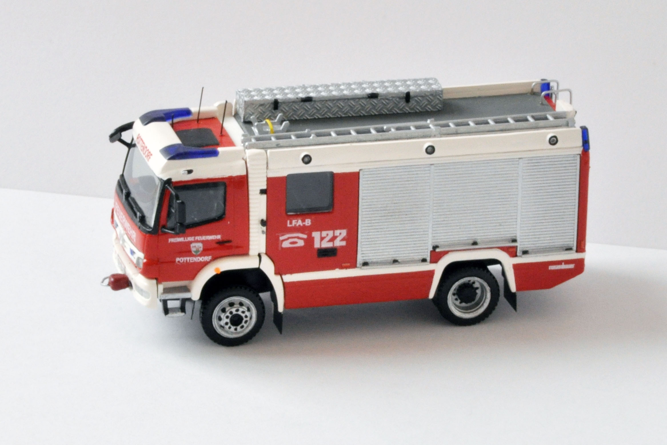 Den Anfang macht das Modell des LFA-B "Pumpe Pottendorf" meiner Heimatwehr, der FF Pottendorf in Niederösterreich. Das Original rückt bei allen technischen Einsätzen als erstausrückendes Fahrzeug aus; die Beladung besteht neben einem Einbaugenerator aus einem hydraulischen Rettungssatz, Hebekissen, diversen technischen Werkzeugen auch aus einer Rosenbauer Fox TS und einer fest verbauten UHPS-Anlage.