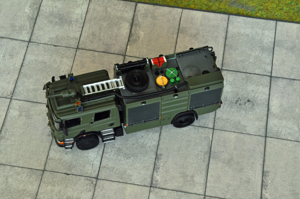 Der Rest beschränkte sich auf das korrekte farbliche anpassen des Modells: Rolläden, Leiter, Griffe Anthrazit; Dach mittelgrau, Saugschlauchkupplungen, Leiter, Trittstufen Aluminium; Schlauchbrücken Rot/Weiß; Blinker , Rückleuchten, Seilwindenabdeckung und Ablassventile entsprechend dem Vorbild; Innenseiten Spiegel Silber.