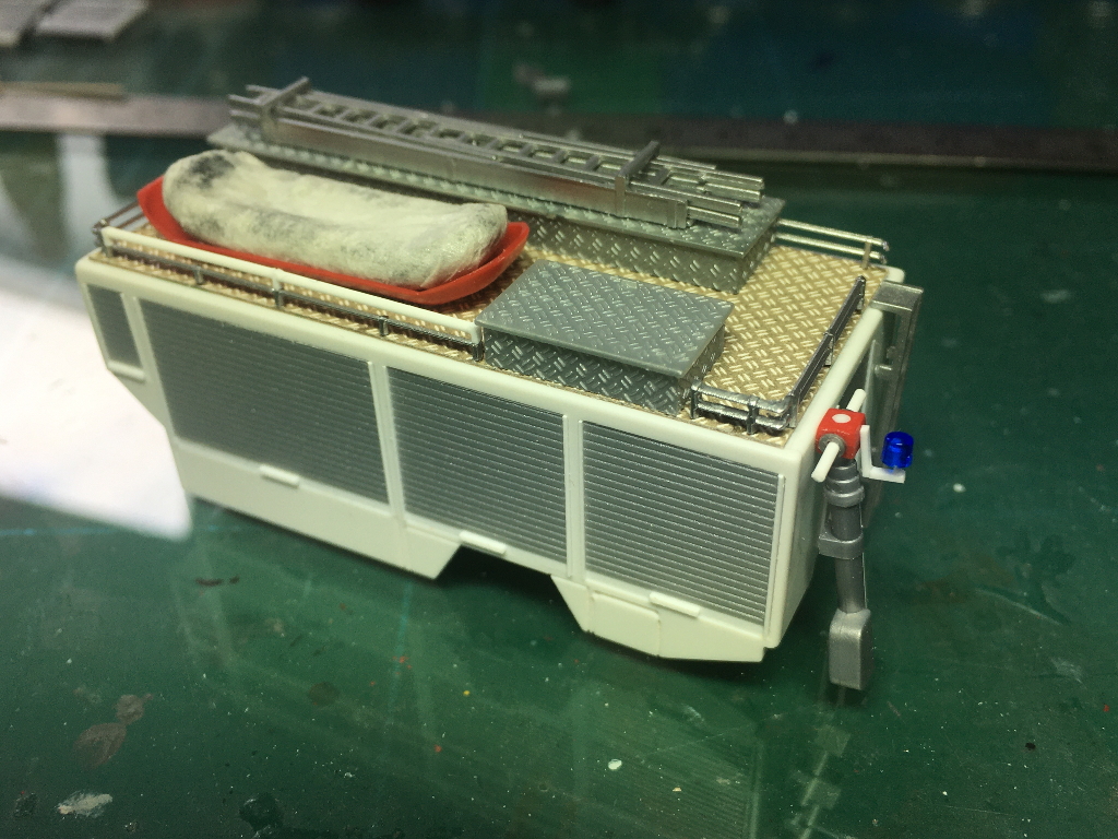 Interessanterweise fiel beim Bau des Modells auf, dass die Rietze Iveco MK LF/TLF einen zu kurzen Radstand im Modell haben, weshalb das Fahrgestell für den Rüstwagen um ca. 2mm beim Radstand verlängert werden musste. Im Original beträgt der Radstand bei LF/TLF/RW 3750mm und nicht wie beim Rietze-Modell 3500mm, was sich aus dem verwendeten Fahrgestell des Mercedes NG von Preiser ergibt. Schlussendlich bedeutet das, dass die Kabine oder der Aufbau, aber vielleicht auch beide Teile von den Maßen her nicht ganz korrekt sind. :?