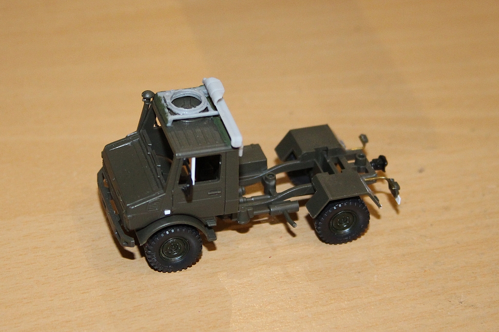 Die neue Halterung der DBS 4000 besteht einfach nur aus zwei passend geschnittenen schwarzen Kunststoffplättchen. Nach den ankleben habe ich diese oben entsprechend mit der Feile passend gefeilt, das war`s. Die beiden Löscher im Dach unterhalb des Balkens habe ich mit 1mm Rundprofil verschlossen. Davon sieht man jetzt nichts mehr.