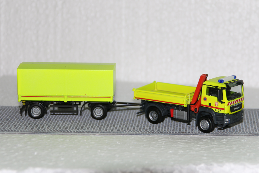 Für den Transport von schwerem Rettungsgerät sowie Erdbaugerät dient dieser Herpa Kipper mit Herpa Pritschenanhänger