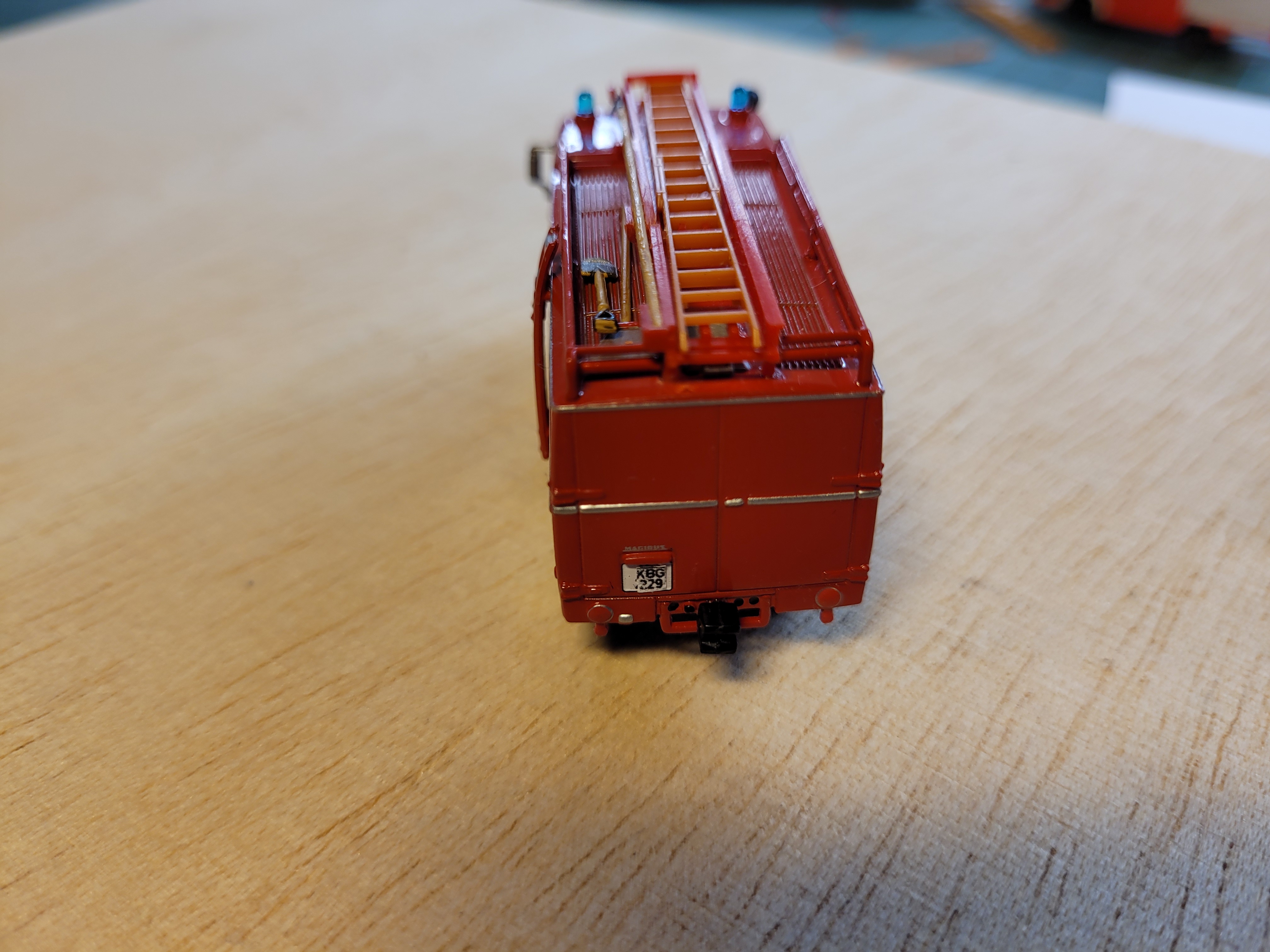 Die neue Leiterhalterung samt Steckleiter und Einreißhaken stammt aus einer Zubehörtüte von Heico, ich habe nur 2 Leiterhalterungen zusammengklebt, um näher am Original zu bleiben. Die Löcher der Saugleitungen wurden unter Feuerpatsche und Spaten versteckt, unter die Leiterhalterung kam noch eine Schuttmulde.