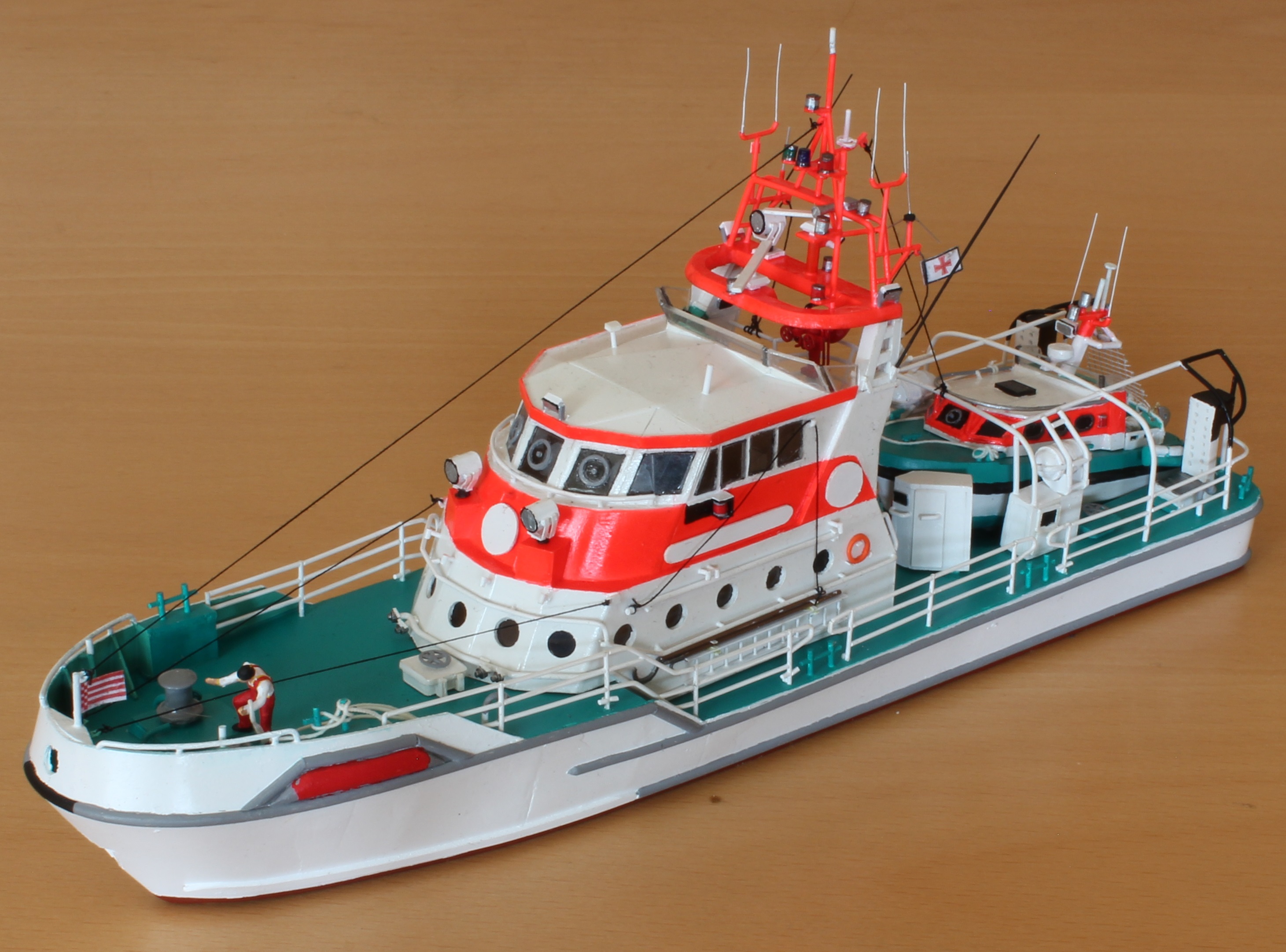 Beim Vergleich haben besonders Model Master und ein alter Topf Roco- Farbe überzeugt. Mit einer Mischung von 1/1 Revell und Vallejo Model Air kamen wir der Model Master Farbe sehr nahe. Beim Seenotkreuzer selber wurde eine 1/2 Mischung Vallejo / Revell genutzt.