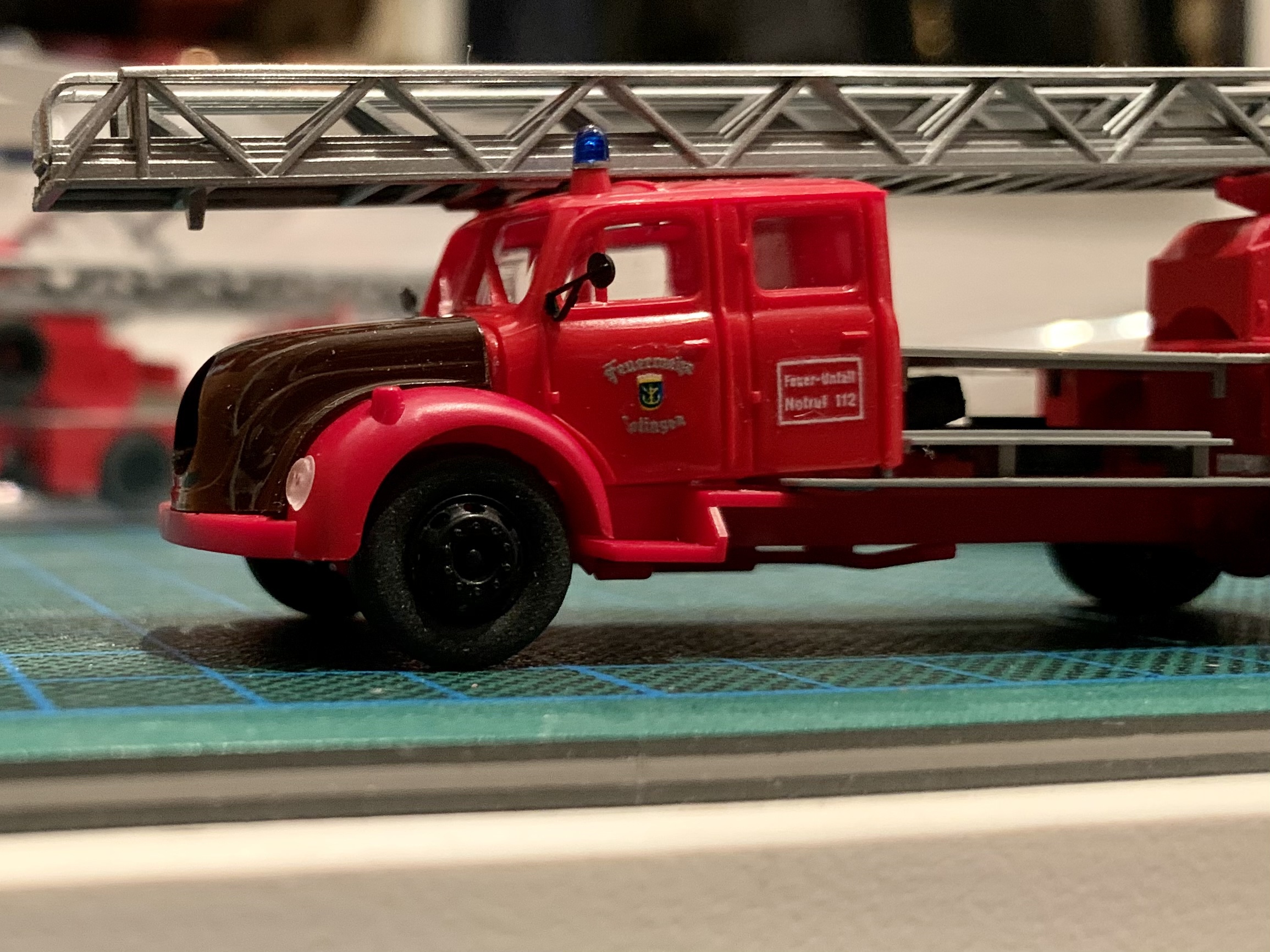 Das Chassis ist noch nicht bearbeitet, daher die nicht stimmige Höhe (hier noch das Wiking-FG). Der Leiterpark kommt nun doch von der Preiser-Leiter, das ist konform zu dem von mir gewählten Vorbild - der DL vom LZ Heinrichstr. der BF Frankfurt/M.