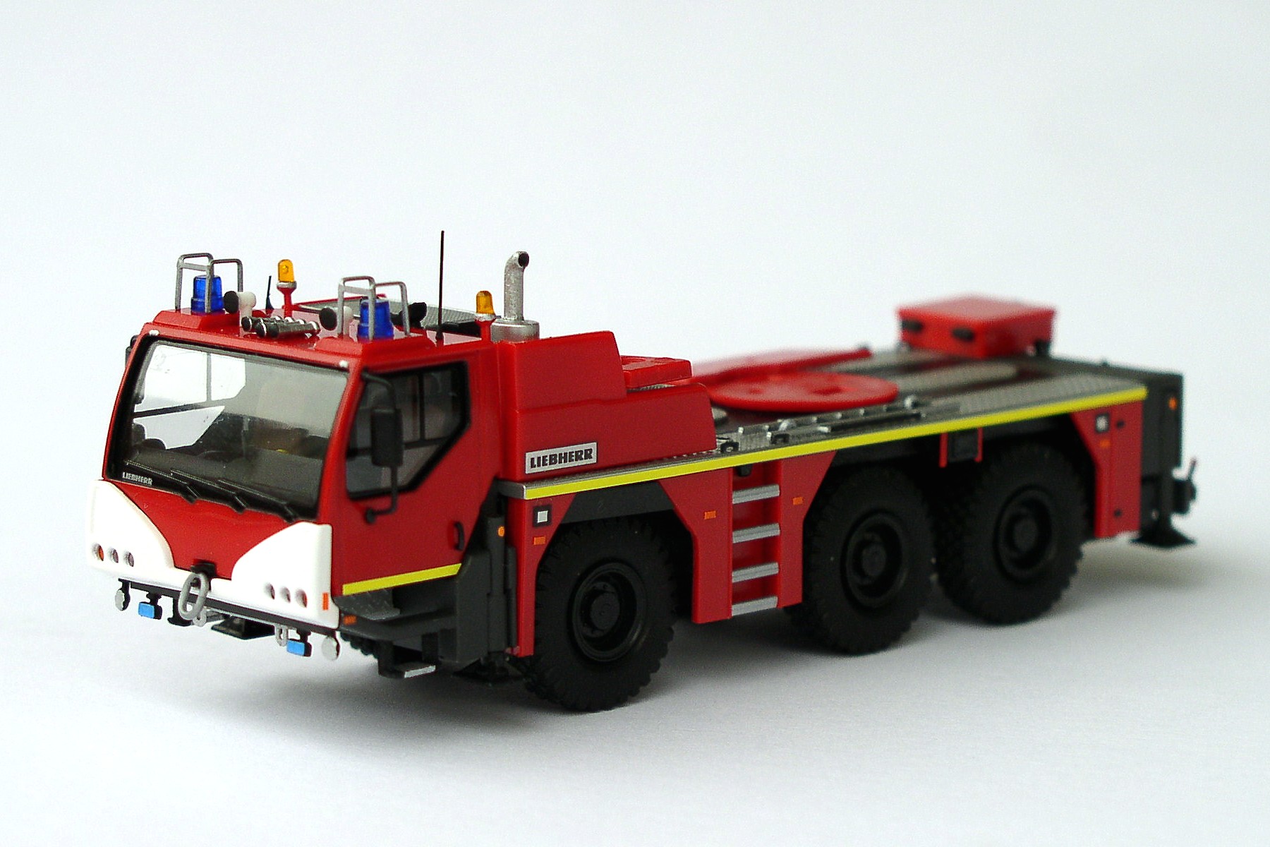 Wer nachlesen will, was es mit dem Unterwagen auf sich hat, muss einfach die Postings hier im Thread weiter oben nochmal nachlesen... Ich hab das Matchbox-Metall-Teil abgesägt und durch rote Teile von diversen herpa-Drehleitern ersetzt. Wichtig war dabei, auf die erhabenen "Begrenzungen" der Teile zu achten. Im Nachhinein finde ich das immer noch recht gelungen. Na ja.