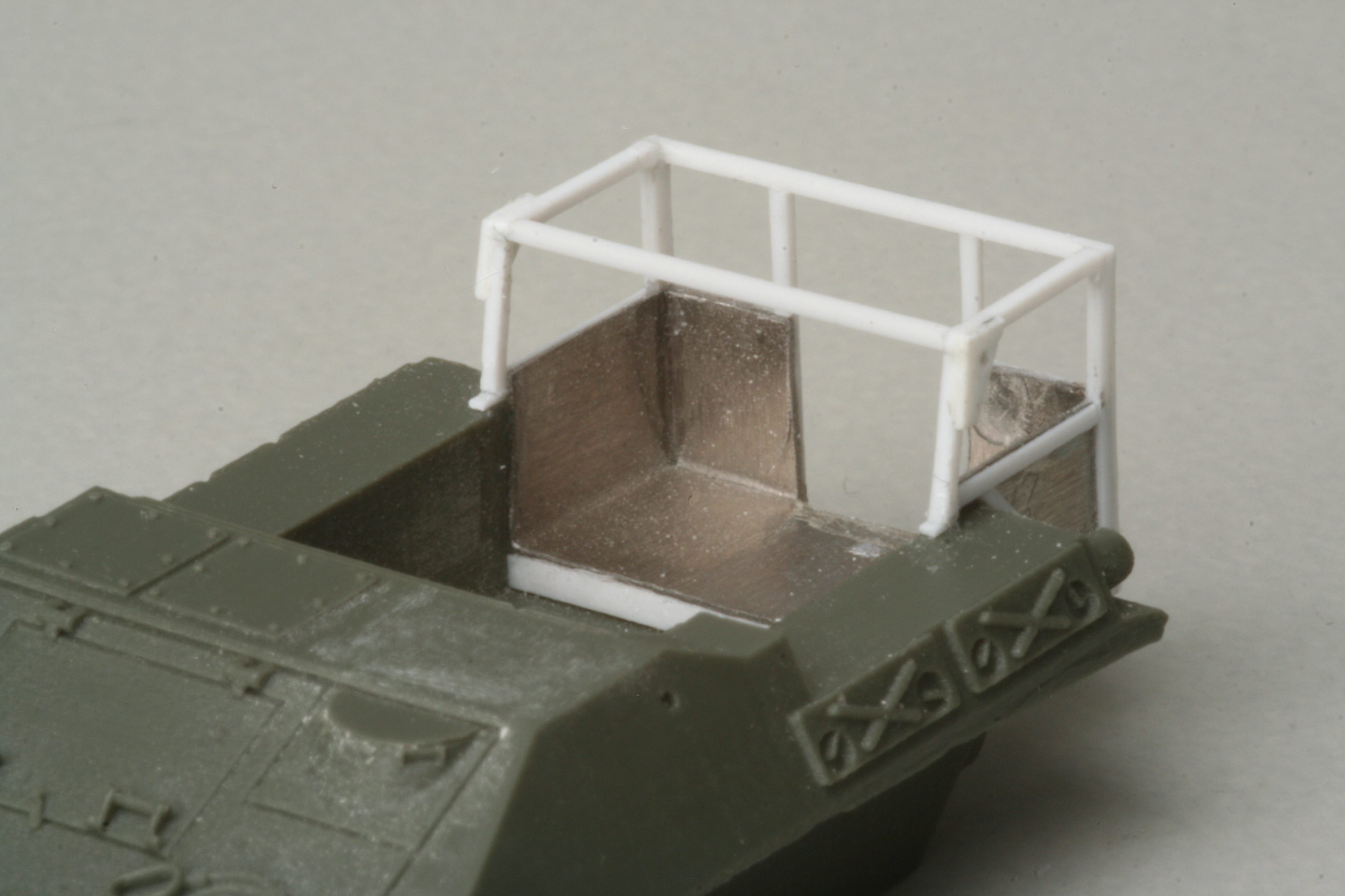 der Rohbau ist nun deutlich weiter fortgeschritten. Weil mein Modell auch eine Besatzung bekommen soll, habe ich den Raum für den Fahrer aufgebohrt und innen mit einem Fräser aufgeweitet. Viele Kleinteile sind auch schon montiert. Die beiden dreieckigen Stützen im Innenraum sollen die Löschmittelbehälter(die noch gebaut werden müssen) tragen.