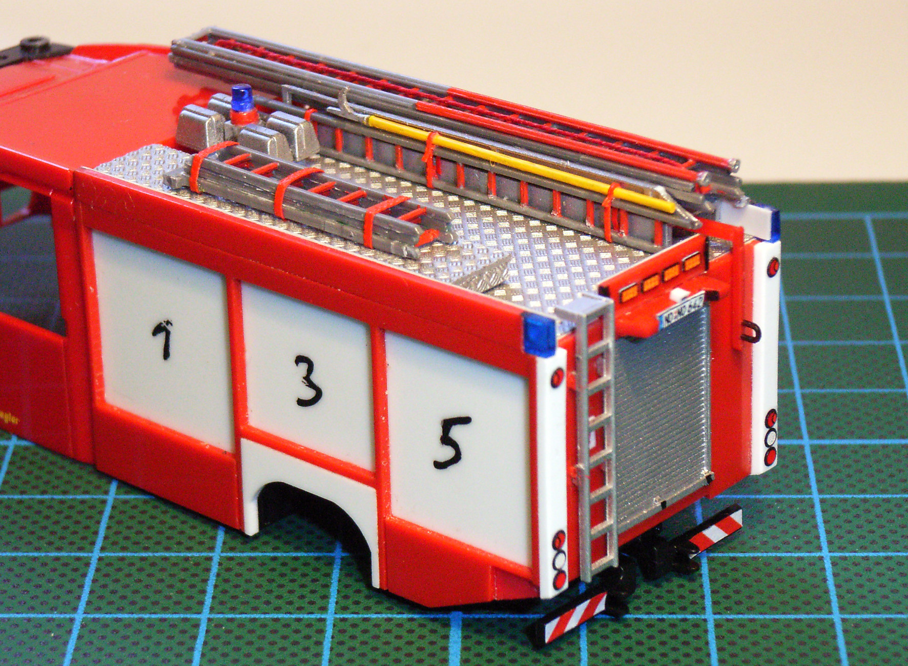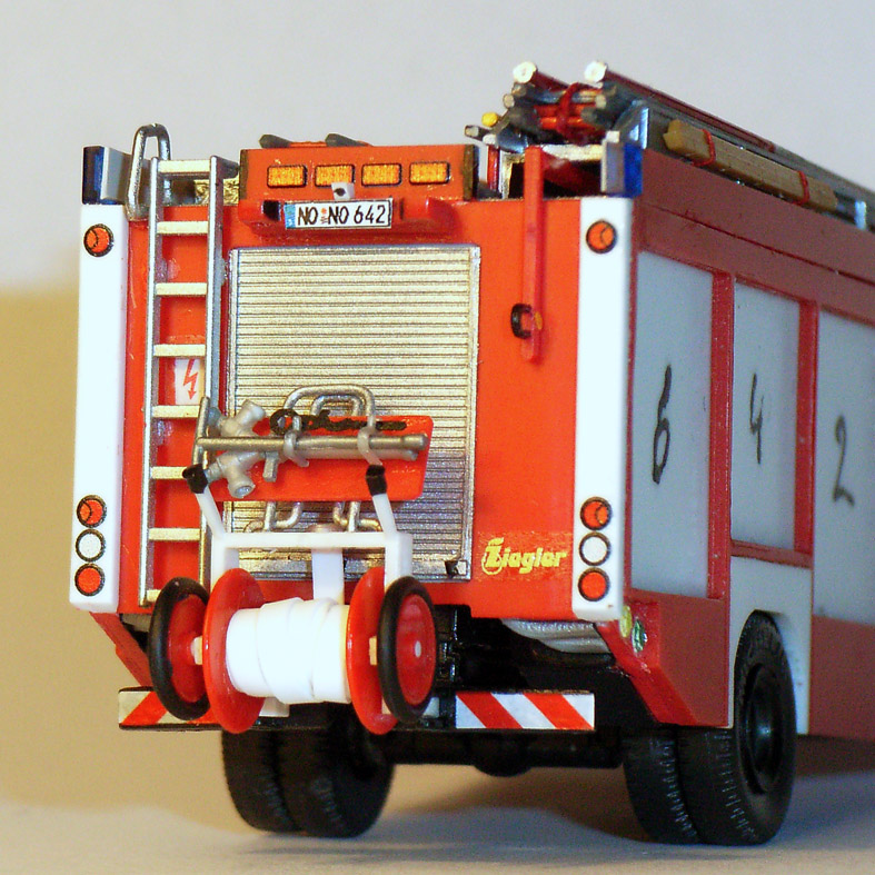 Aber was soll das Jammern - immerhin sind Heck und Dach jetzt fertig. Die Haspel werd' ich separat bearbeiten, weil mich noch keine der möglichen Darstellungen von Schlauchmaterial so richtig begeistert hat. Montiert habe ich dreiteilige Schiebleiter, Einreißhaken, Klappleiter, Hakenleiter, Abgasschlauch, Leiterentnahmehilfe und ein paar Decals - das Übliche halt!