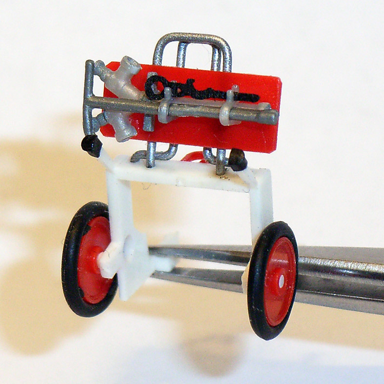 Für die Wasserentnahme aus dem Hydrantennetz führen die neueren Löschfahrzeuge in Nordstadt auf der Barth-EPH Hydrantenstandrohr, Standrohrschlüssel und Schlüssel B für Überflurhydranten mit. Das alles ist auf einer Grundplatte aus rotem Karteikarten-Sheet verlastet und mit zwei Leichtmetallbügeln (ehem. Preiser-Haspelgriffe) gut befestigt! Die 11 x 4 mm große Platte wiederum wird auf der Rückseite von zwei weißen ?-förmigen Bügeln (ehem. Preiser-Verkehrsschilder) gehalten.