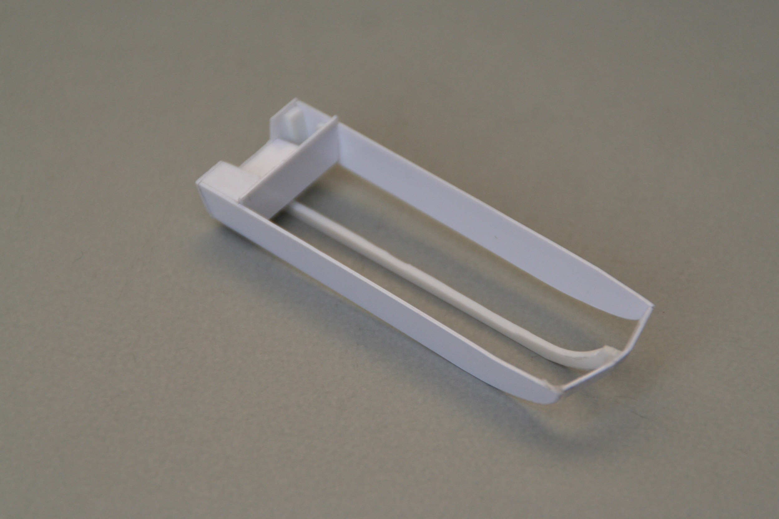 Die nächste Bildreihe zeigt den weiteren Fortgang. Auf den Kiel habe ich einen Plastikstreifen geklebt, der den inneren Gang im Boot darstellt. Darauf aufliegend wurden zwei weitere Plastikstreifen zu den Seitenwänden hin verklebt. Das zweite Bild zeigt, wie das von unten aussieht. Nach vorne hin wurden in Absatzform immer ein wenig erhöht weitere Streifen eingeklebt. Auf dem dritten und vierten Bild ist bereits zu erkennen, wie ein aufgeklebter Streifen aus einer durchsichtigen Modellautoverpackung den Absatz in der Rumpfseitenwand ergibt. Die rechte Seitenwand wurde durch einen etwas dickeren Streifen erhöht und die Trennwand für den Steuerstand eingebaut.