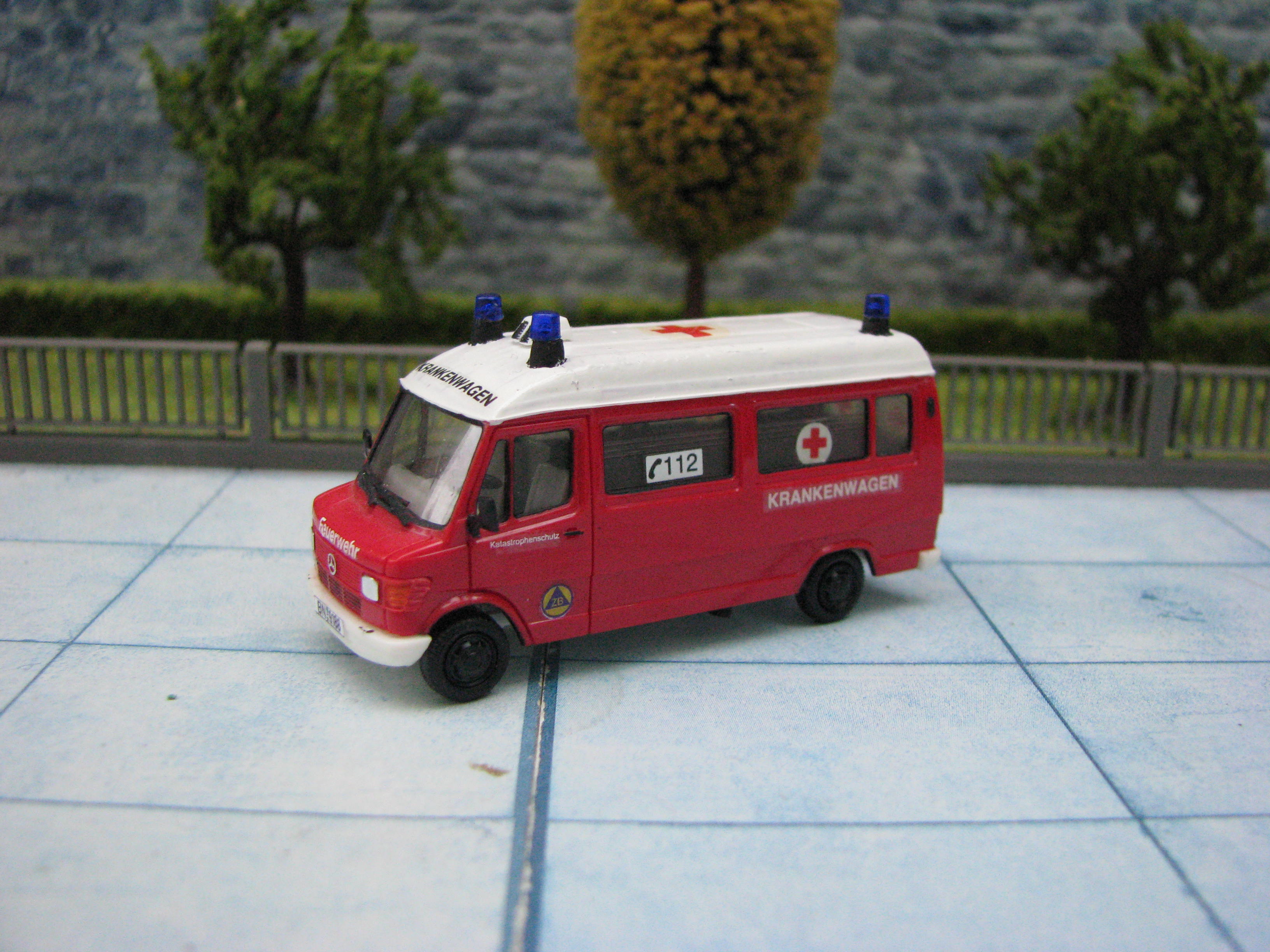 KTW auf Mercedes-Benz 209 Hochdach beschafft, welches den normalen Transportdienst übernimmt und vom öffentlichen Rettungsdienst oder der Feuerwehr besetz wird.