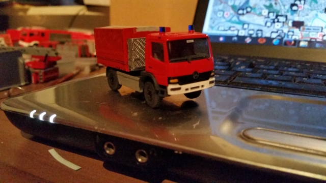 Das LF 16 TS der FFW Alexandersberg-Waldau, basierend auf MEK-Kabine und Preiser-Aufbau. Lackiert in RAL 3000 und mit KatS-Decals versehen.