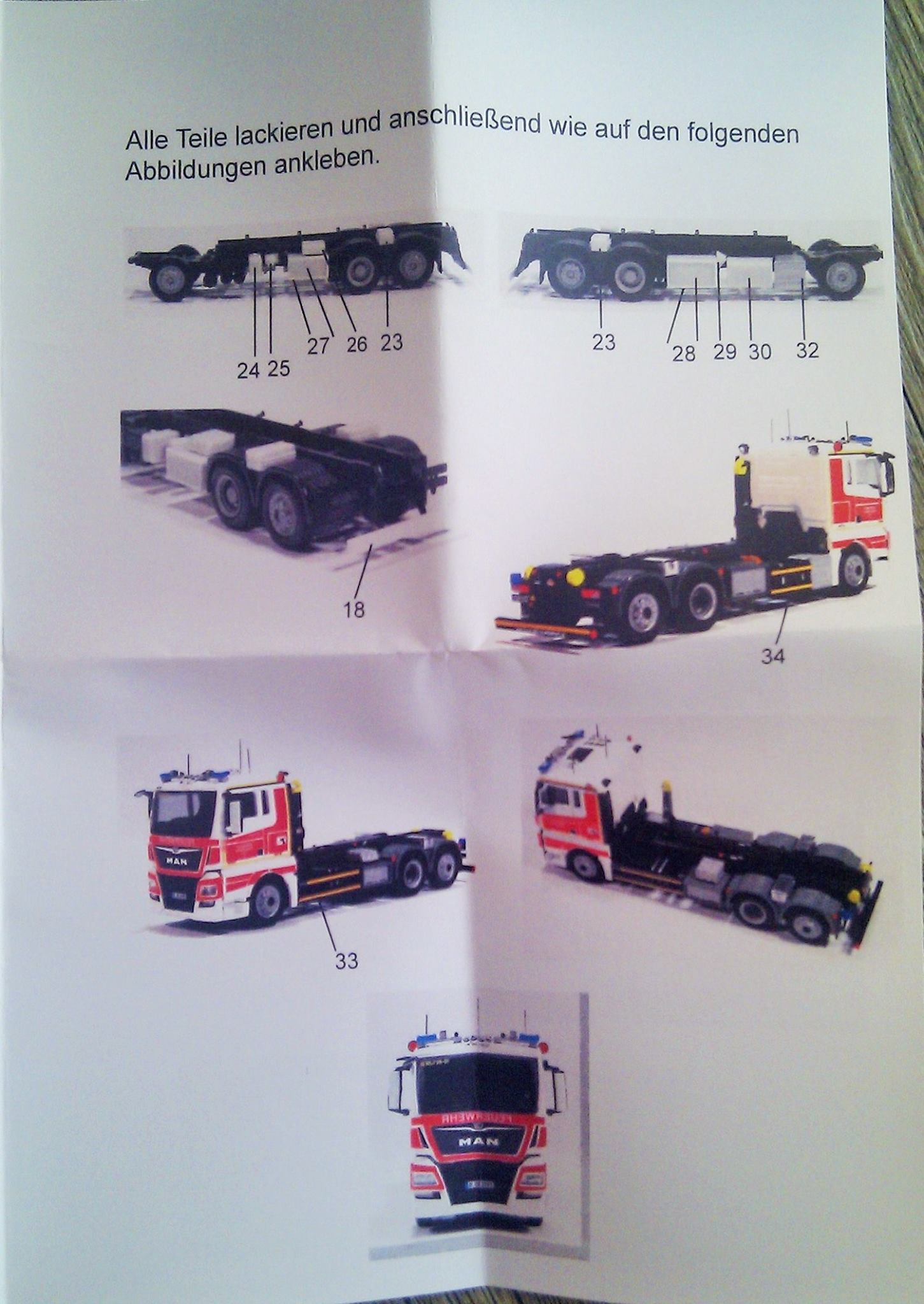 Der Umbausatz wird im bekannten Karton (mit Farbfoto) geliefert und beinhaltet neben den Herpa-Serienkomponenten (MAN Fahrerhaus + Fahrgestell 3-achs mit Abrollkinematik) diverse Zurüstteile aus Resin, 2 Decalsätze sowie eine farbig bebilderte Bauanleitung.