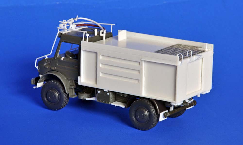 Beim Prototypen musste ein kürzeres Kibri Unimog-Fahrgestell herhalten, von dem auch die flache Kabine stammte. Sehr schön fand ich die Profilierung der Y-Modelle Räder, nur das lackieren ist schwieriger da sie leider aus einem Teil bestehen.