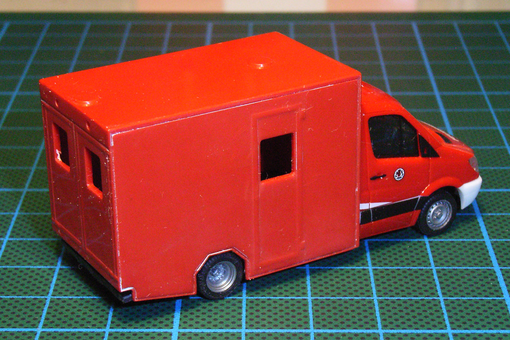 Der GSF-Koffer des Nürnberger RTW musste leider aufwendig von seiner großflächigen Bedruckung befreit werden, dazu habe ich aber - wie bereits erwähnt - nicht den Lux DLE sondern den Farblöser Z 251 von Gaßner verwendet. Wie das genau funzt habe ich ja hier schon beschrieben. Letzte Farbschleier werden dann noch mit Polierpaste und 12.000er Schleifleinen von Dr. Flörke eliminiert - dann passen Aufbau und Fh. auch farblich wieder zusammen!
