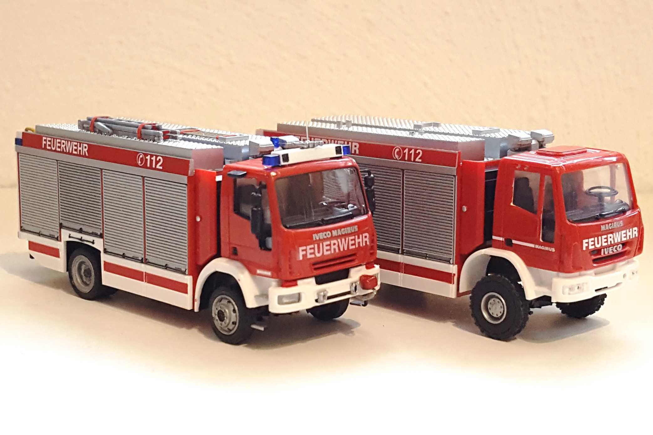 Das Modell ist eine Kombination verschiedener Rietze Komponenten: Fahrgestell mit Haspelhalterung und vordere Kotflügel stammen von einem Alufire3 HLF, auf das der bekannte Rüstwagen-Aufbau gesetzt wurde. Nach ein paar Anpassungsarbeiten passte dann auch das Iveco-Fahrerhaus ohne weitere Probleme auf die HLF-Kotflügel. Zu guter Letzt folgten noch einige Zubehörteile wie Seilwinde, Griffe usw. Im Bild rechts noch der Vergleich zu einem (nahezu) unbearbeiteten Serienmodell von Rietze.