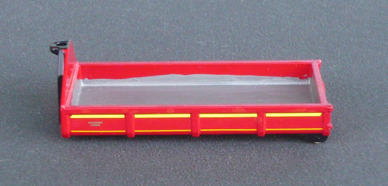 Die altbekannte kurze und flache Mulde von Herpa wurde mit einer Plastikplatte an der Hakenaufnahme ergänzt. Die Lackierung erfolgte unter Verwendung von Humbrol Nr. 19 mit dem Pinsel.