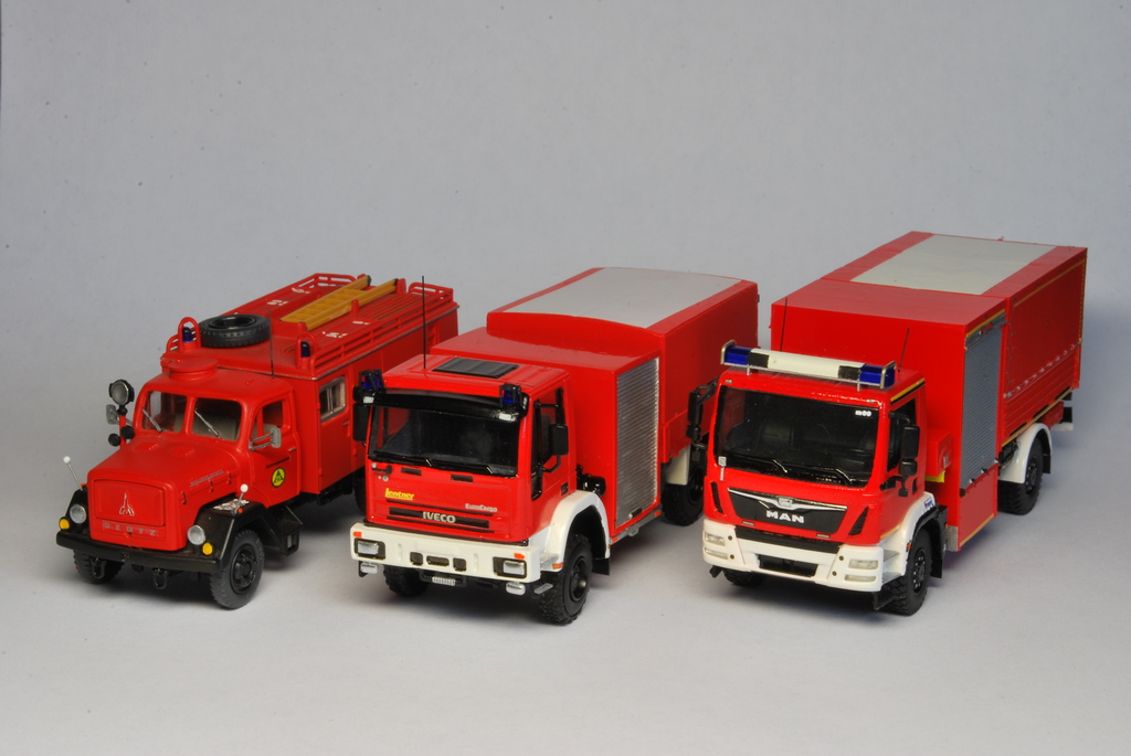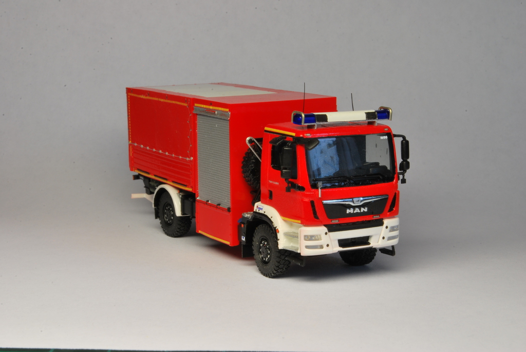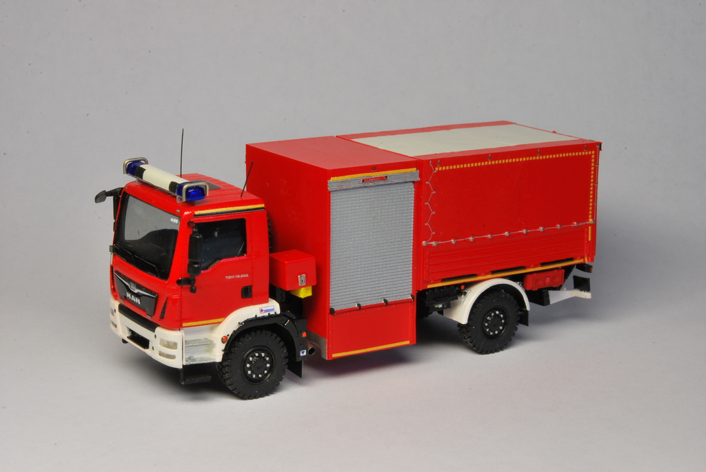 Der Bausatz des Modells stammt von Allgäu-Modellbau und wurde weitestgehend aus der Schachtel gebaut. Die Decals sind von MBSK, genau wie die Kraftstoffkanister unter der Ladefläche auf der Beifahrerseite. Der Blaulichtbalken kommt von Rietze.