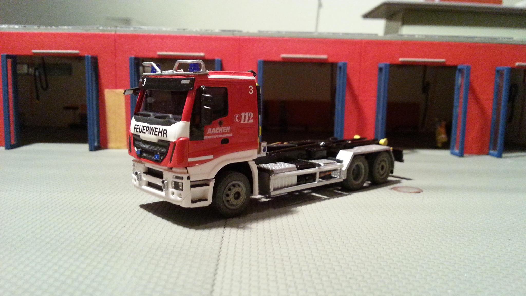 Nun zum Modell. Als Basis habe ich einen Magirus von Roco genommen. Die Kabine und das Fahrgestell habe ich eins zu eins übernommen. Die Pritsche habe ich um ein Element gekürzt und wieder zusammen geklebt. Am hinteren Fahrgestell wurde dann noch eine zusätzliche Stoßstange angebracht. Das Modell wurde dann in RAL 3000 lackiert. Der Kran stammt auch von Roco. Er wurde aber in nicht lackiert (wobei ich überlege es doch noch zu tun). An der Kabine wurden dann noch aus Roco Zubehör die Blinker angebracht und Diverse Decals.