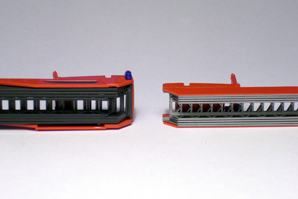 Drehstuhl ist durch Wegschneiden eines Querträgers (oh Mann, wie soll man das denn beschreiben...?) der vorbildgerecht schmalen Leiterwippe angepasst worden. Am (noch) anthrazitfarbenen Heck gibt es jetzt Aussparungen für die Befestigung der