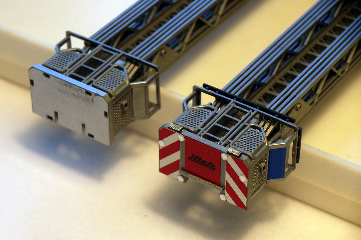 Abstützungen haben aus Decals eine rot-weiße Warnschraffur und gelbe Blinkleisten bekommen (auch wie bei der Atego-Leiter).